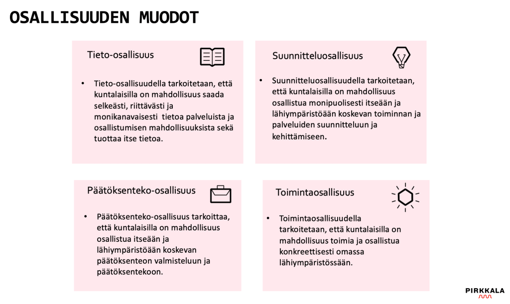 Me Pirkkalassa olemme tarttuneet osallistumisen haasteeseen palkkaamalla osallisuus- ja hyvinvointikoordinaattorin. Hänen pääasiallinen tehtävä on keskittyä ja kehittää parempaa mahdollisuutta ja sopivia keinoja osallistumiseen. Asia on puhuttanut kovasti tällä vaalikaudella, tiedon määrän ja saatavuuden lisääntyessä.